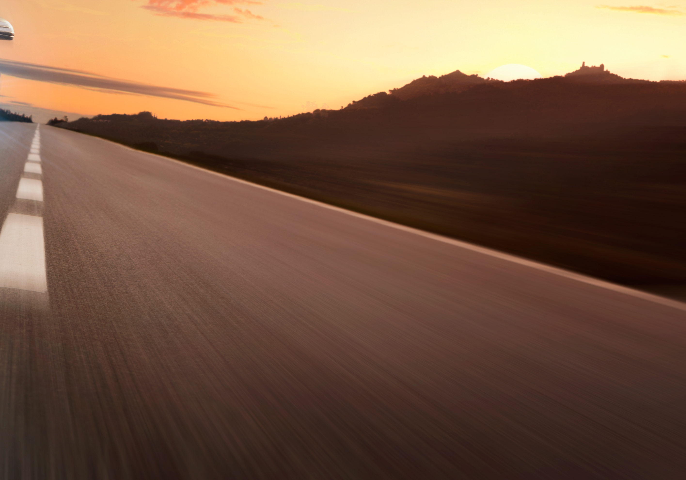 An image of a blurry road and a sunset over the hill.